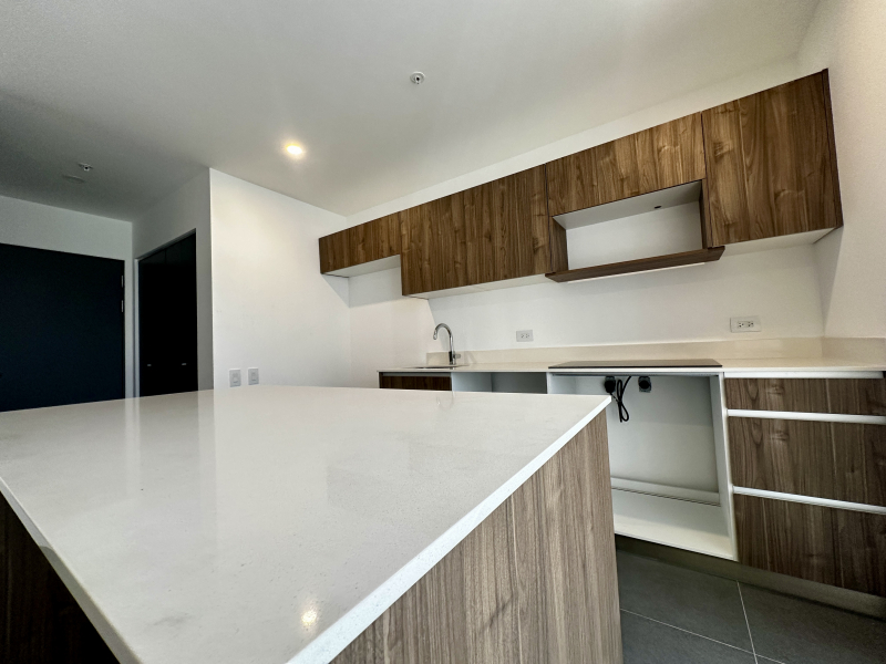 El apartamento ofrece espacios bien aprovechados, con excelente entrada de luz natural gracias a ventanales de piso a techo que crean una sensación de amplitud y calidez. La zona social fluye naturalmente hacia la cocina, que cuenta con sobres de cuarzo y una estética contemporánea que armoniza con el resto del diseño interior.